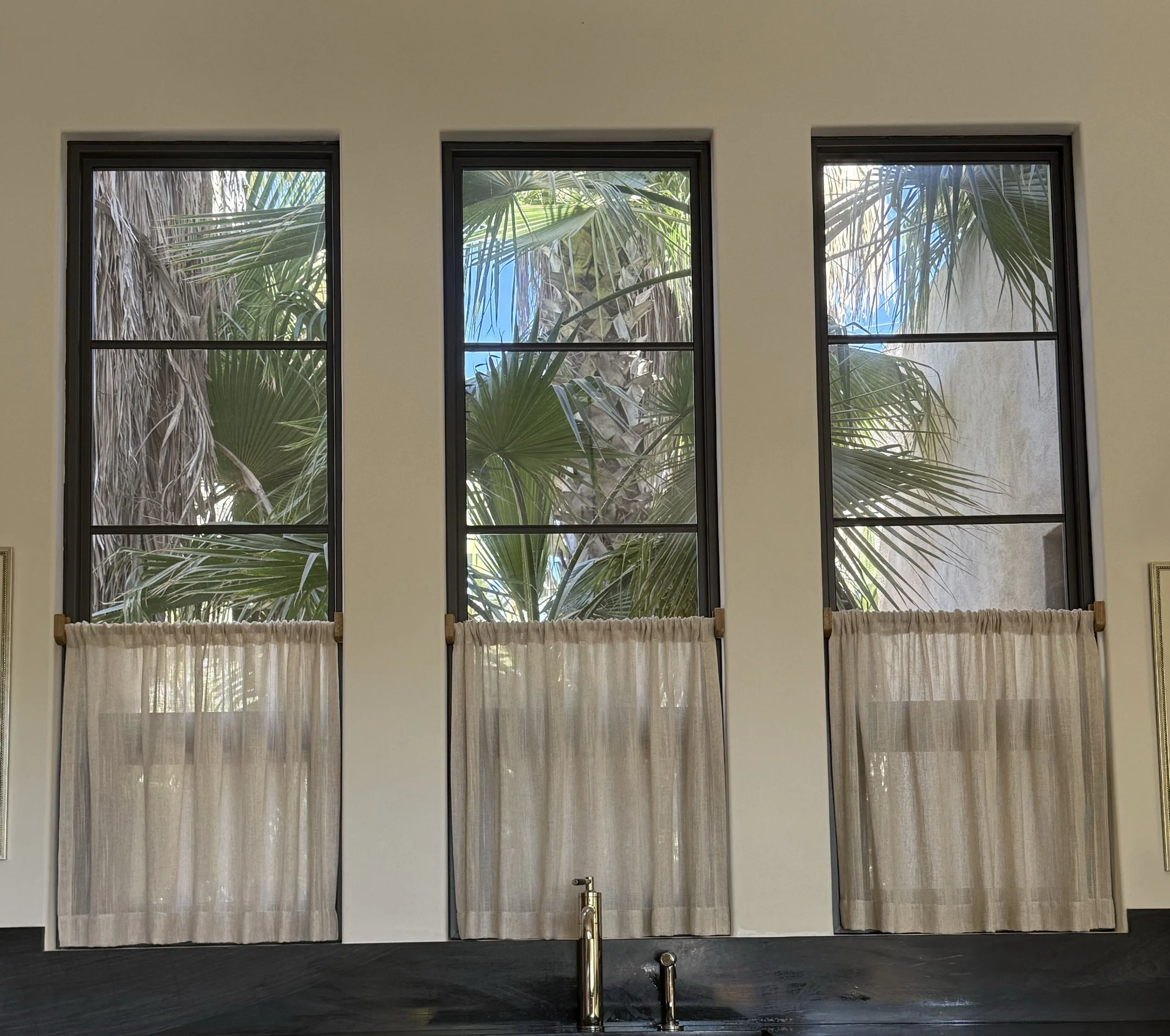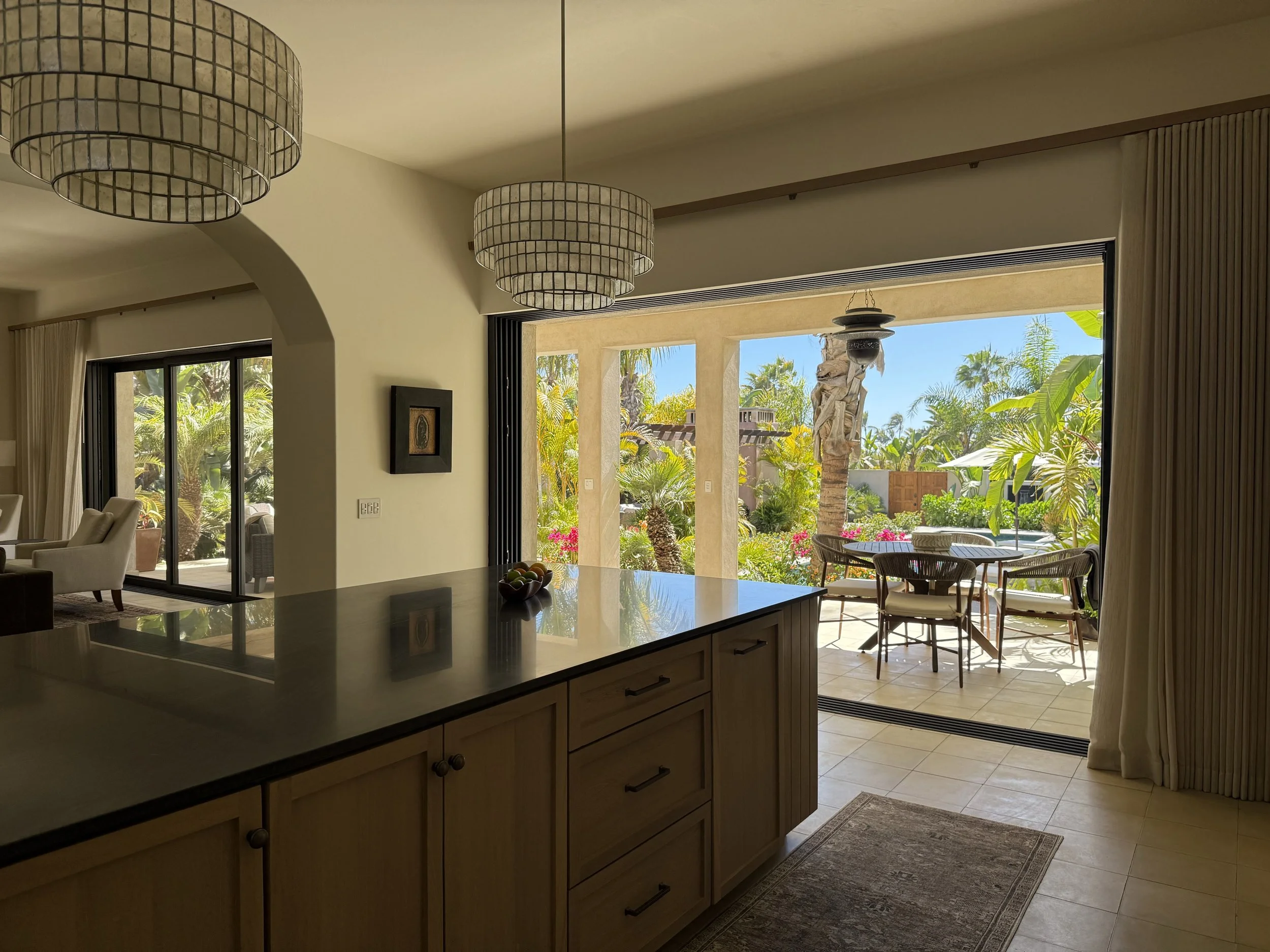 Pocket doors fully open kitchen to the covered patio and a four top dining table.