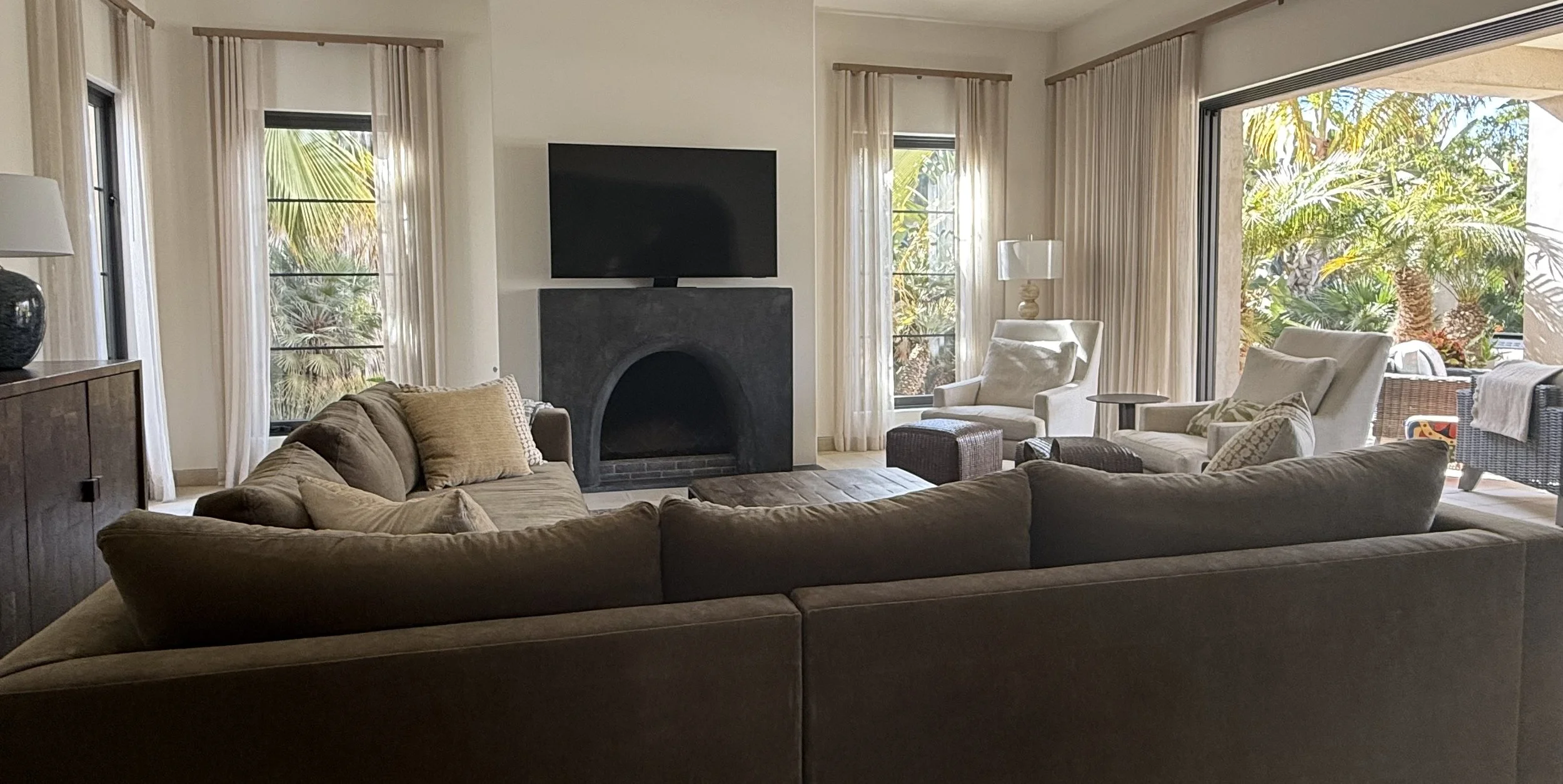 On Baja’s chilly evenings, relax in this comfy but spacious living room with gas fireplace. TV package includes live US and premium channels.