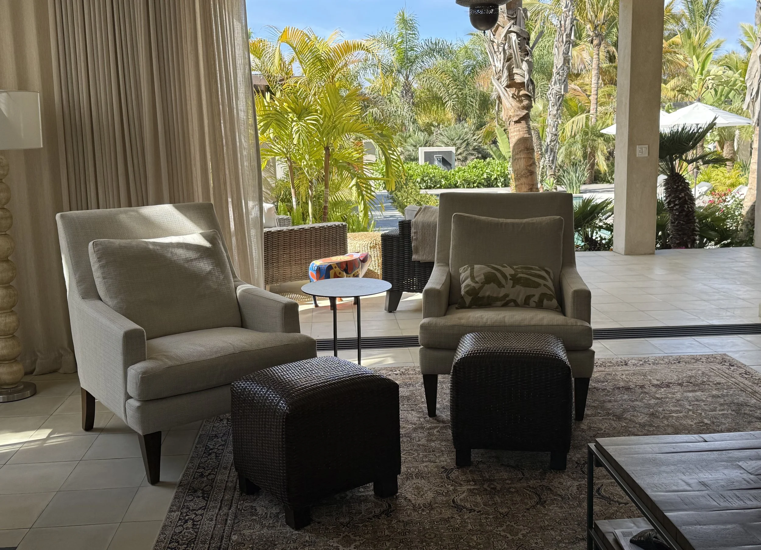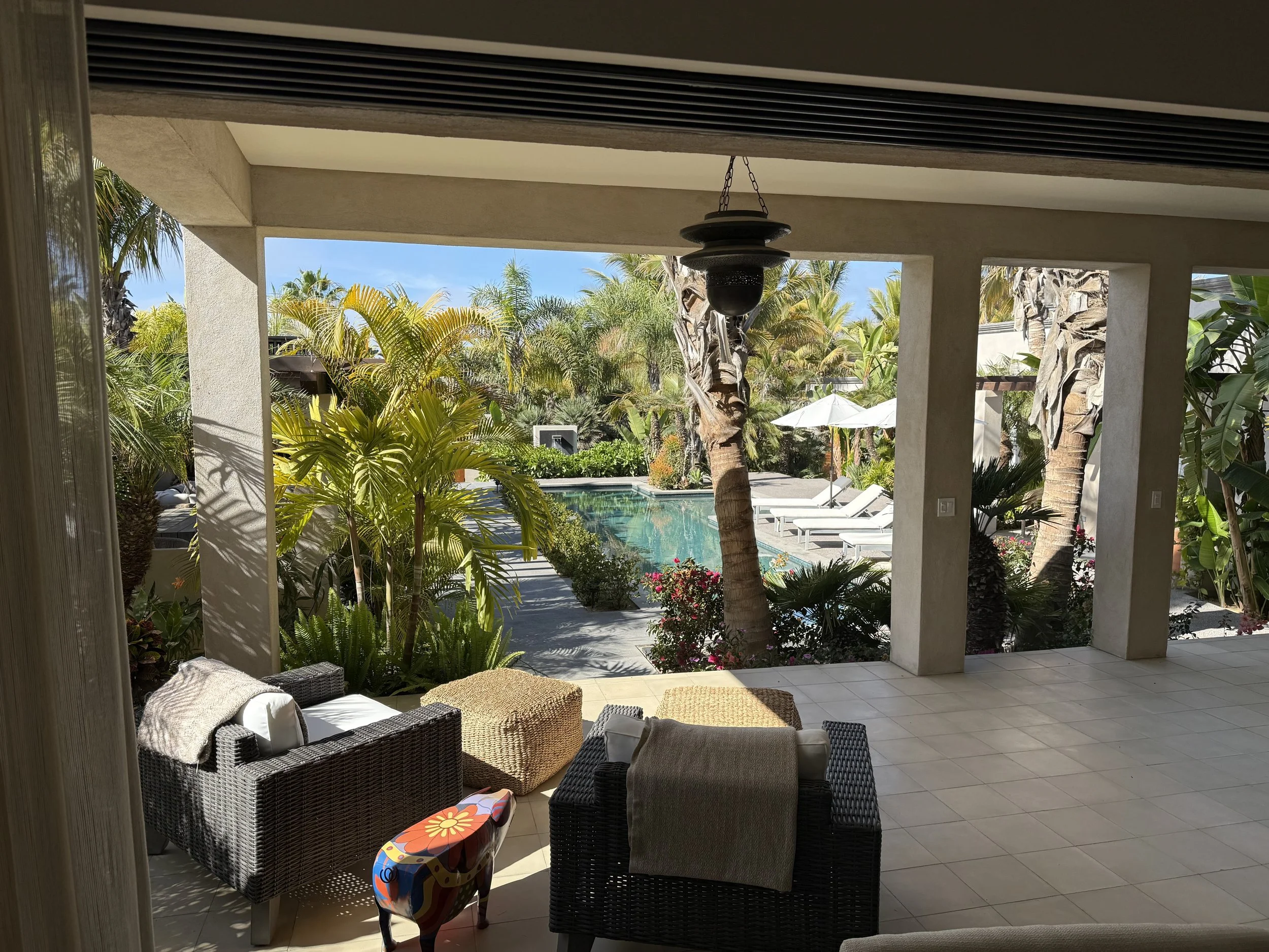 Large pocket doors open onto covered exterior patio with additional seating area overlooking courtyard.